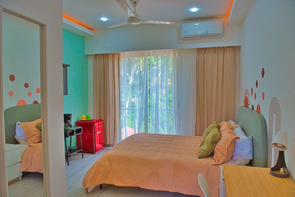 - Estudio Summer , de 25 mt2 y balcón , baño propio , completamente amueblado( cama queen, escritorio, mueble ropa, meseta y cafetera, nevera, tv smart , Ac inverter Smart, shooters a las ventanas , ventanas europea con cristal templado, puertas en madera preciosa roble , pisos porcelana, techos modernos en cirol con doble juego de luces )