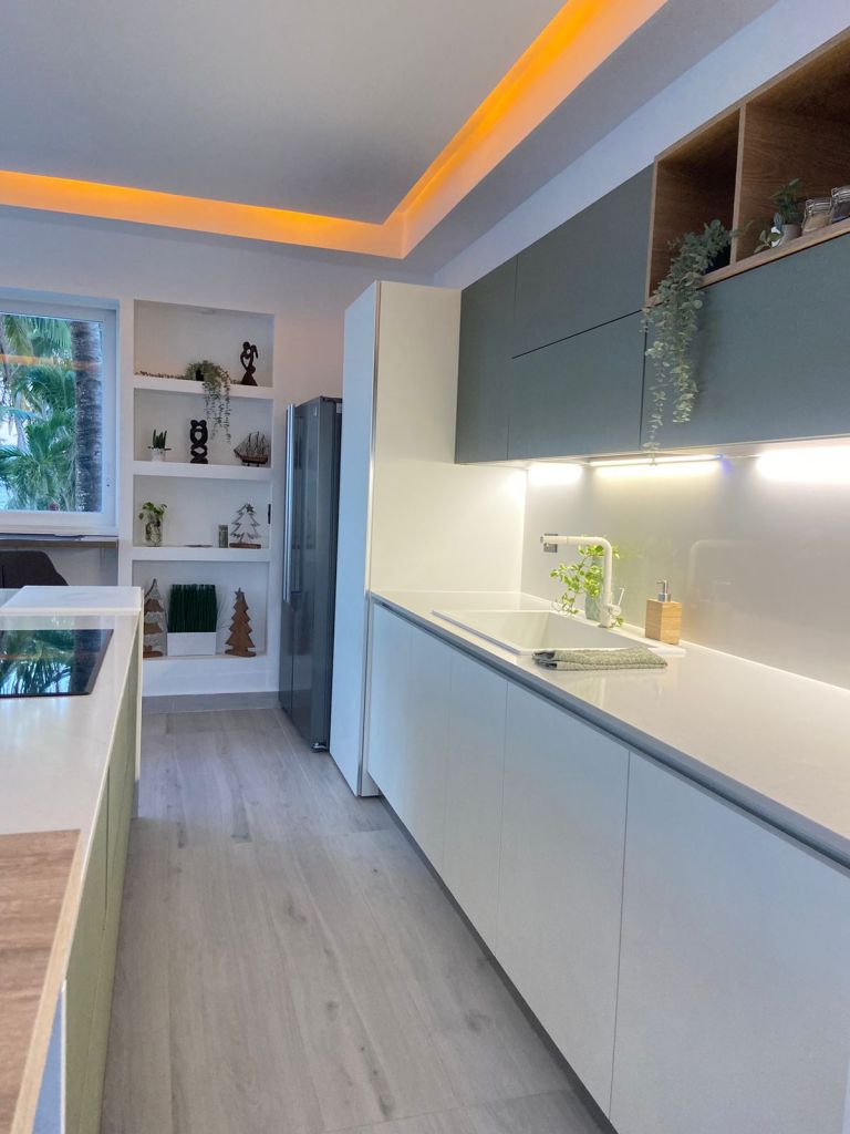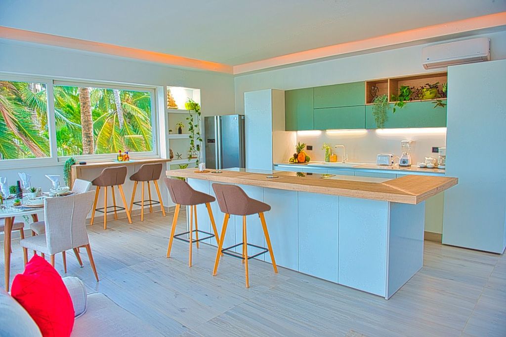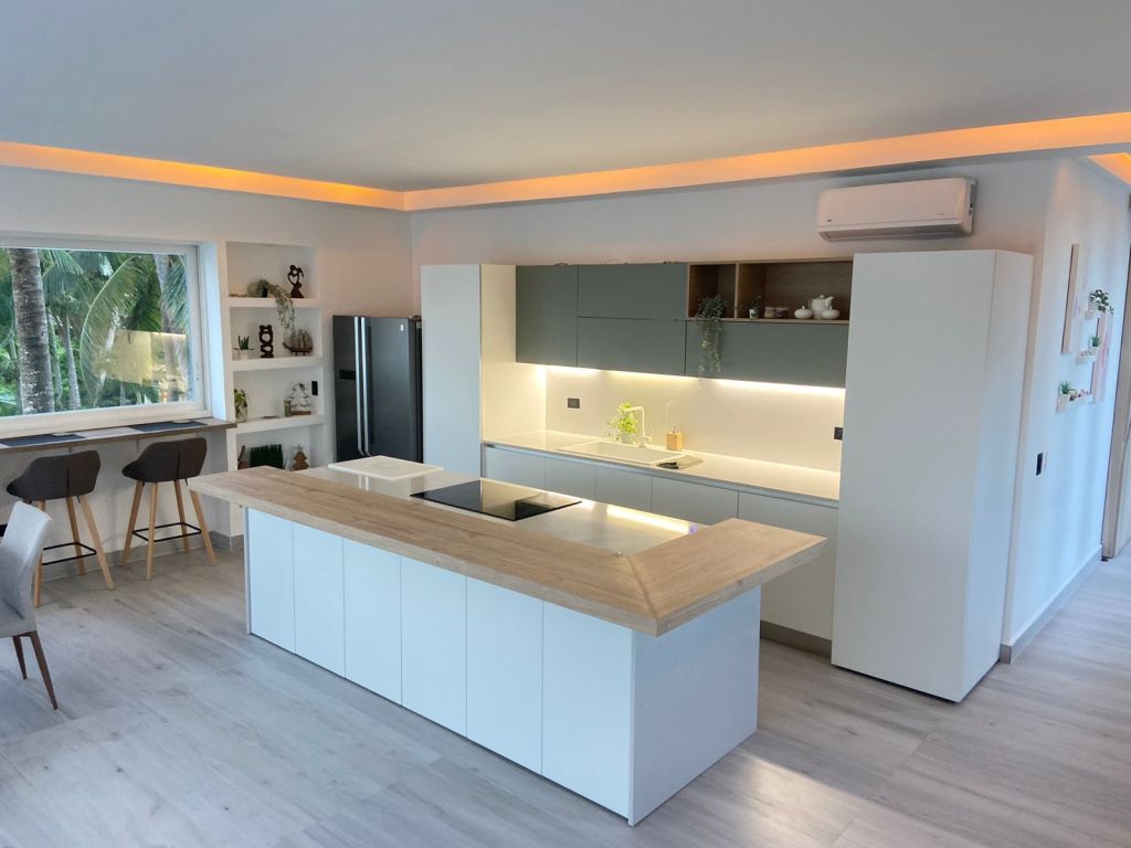 - Apartamento Scandinavia , de 60 mt2, sala amplia, cocina italiana en quartz , balcón principal de 11 mt2, dormitorio principal con baño y un balcón por igual; cama king, walking closet amplio ,Tv smart , Ac inverter Smart en la sala y en el dormitorio, shooters a las ventanas , ventanas europea con cristal templado, puertas en madera preciosa roble , pisos porcelana, techos modernos en cirol con doble juego de luces )
